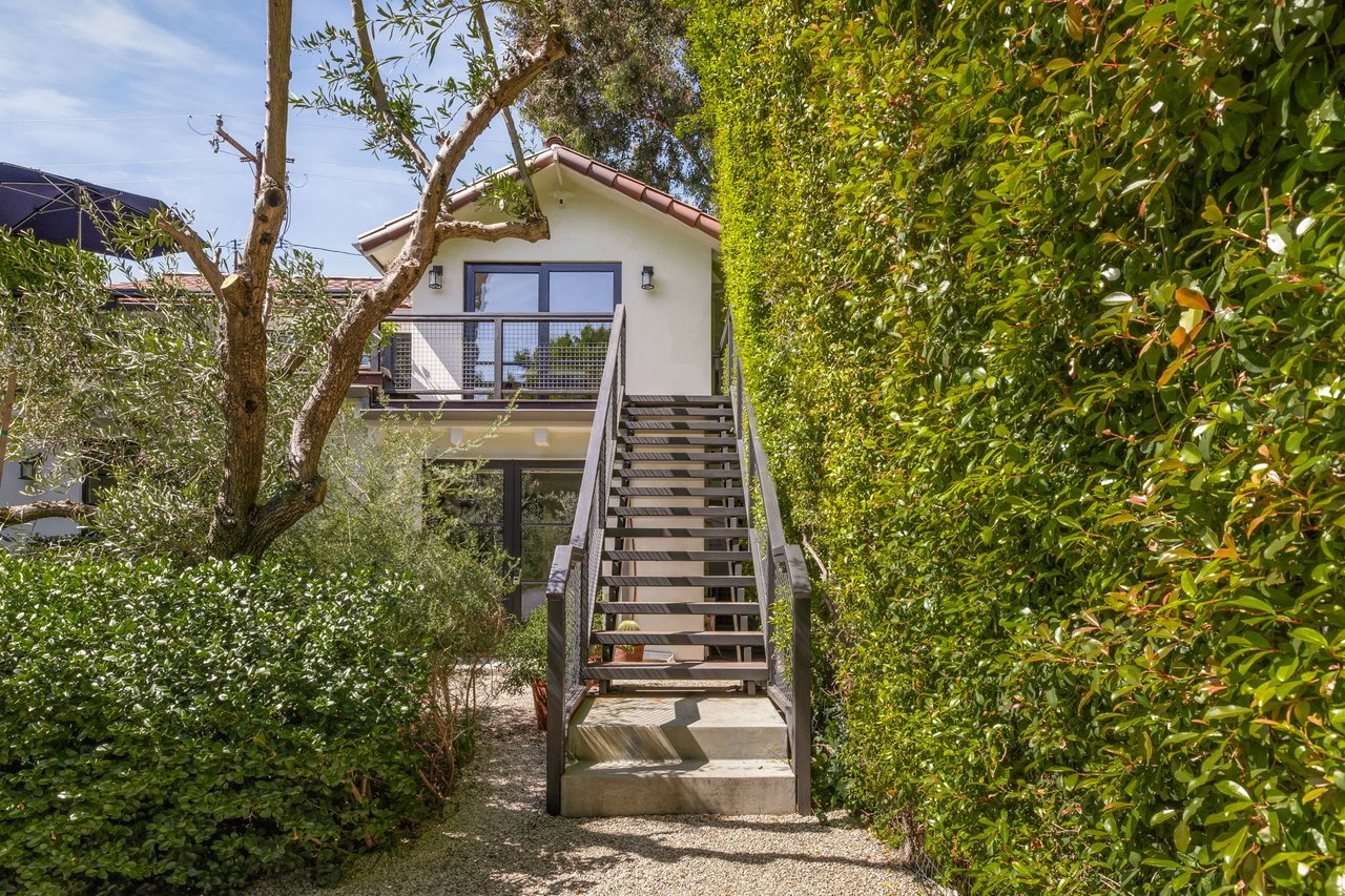 Tucked behind tall hedges in prime West Hollywood West, this stunningly reimagined 3BD/3BA delivers the perfect blend of charm, comfort, and high design. Set at the back of the lot, the home features a gorgeous and spacious front garden with lush landscaping and room for a pool - your own private retreat just moments from the city's best dining, shopping, and nightlife. The elegant downstairs includes a serene primary suite with a beautifully appointed bath and walk in closet. Also downstairs, a romantic library/game room, full bath and secondary bedroom. Ascend the stairs to the upper level where sunlit vaulted beam ceilings create a loft-like vibe with generous living and dining spaces that flow effortlessly into a designer chef's kitchen outfitted with Sub-Zero and premium stainless appliances. A third bedroom with full bath currently used as a home office completes the upper level. Off the living room, a large wood deck creates the perfect outdoor lounge or dining area ideal for entertaining or relaxing. With thoughtfully curated finishes, seamless indoor-outdoor living, and a layout that adapts to modern life, this one-of-a-kind residence offers both tranquility and access all in the heart of WeHo.